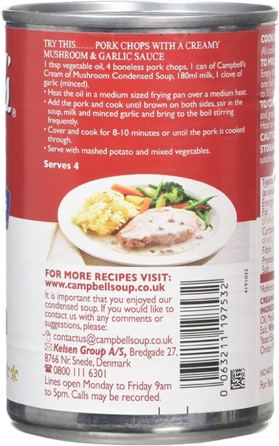 Campbell's Condensed Cream of Chicken & Mushroom Soup - 10.5oz QUALITY INGREDIENTS: Starts with tender chicken with no antibiotics, mushrooms, & cream. GREAT FOR COOKING: Use as a timesaving ingredient. SAUCE STARTER: Try it in Quick Creamy Chicken & Noodles. FEEL GOOD COMFORT FOOD: Add creamy deliciousness to any recipe. PANTRY STAPLE: Each can of condensed soup has about 2.5 servings. Campbell's Cream Of Mushroom Soup Label - This Nutrition Campbell's Cream Of Mushroom Soup Label. Author: Maryam Ayres Last Updated: August 08, 2022. Learn more information about campbell's cream of mushroom soup label. In this article we'll discuss campbell's cream of mushroom soup label. Campbell's Condensed 98% Fat Free Cream Of Mushroom Soup … Join Campbell’s in cooking in the kitchen with Cream of Mushroom Soup with no sugar added** that instantly adds creamy comfort to any dish. This Cream of Mushroom Soup starts with high-quality mushrooms, garlic, and farm fresh cream. Try Campbell’s 98% Fat Free Cream of Mushroom Soup in Swedish Meatballs or Easy One-pot Beef Stroganoff!