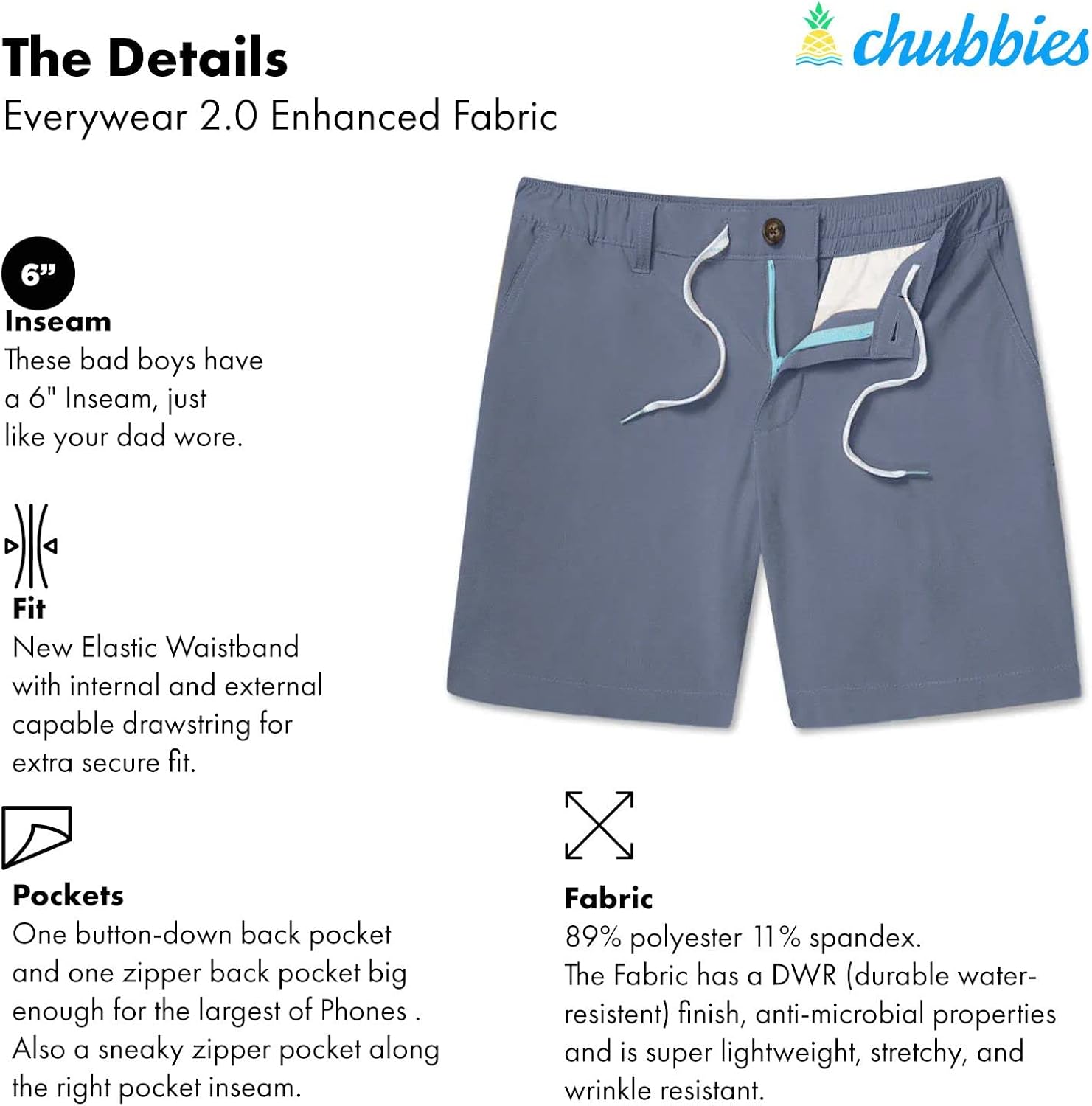 The Chesterfields 5.5" (Stretch) - chubbiesshorts.com Product Details. They're made from our newest, fanciest, most-technologically-advanced stretch casual fabric for the ultimate in movability and flexibility. They even feature an elastic waist, a 5.5-inch inseam and an updated (read: improved, more comfortable) fit. Nothing will make your thighs look as good as these.