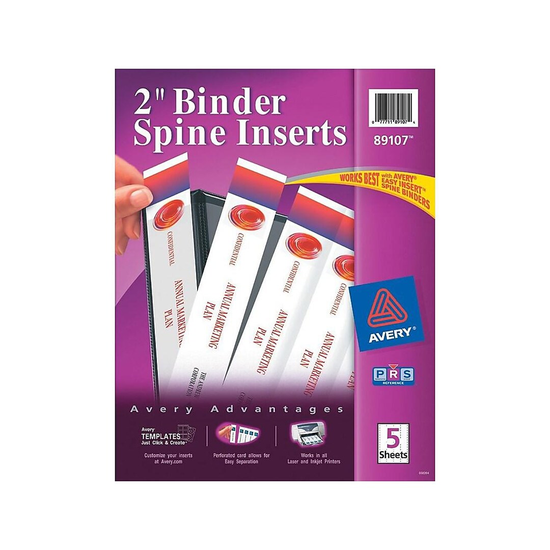 Avery 89109 Binder Spine Inserts, 3" Spine Width, 3 Inserts per Sheet ... Create professional-looking spines with binder spine inserts using free templates from Avery Design & Print. Micro-perforated cardstock allows for easy separation of each spine. Firm cardstock makes it even easier to insert each spine into a binder. Spine Width: 3"; Color(s): White; Machine Compatibility: Laser Printers; Inkjet Printers.